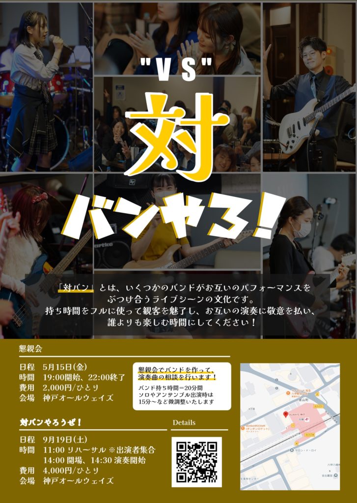 ソアー音楽教室の発表会といえば、生徒さんでチームを組んでライブを行う【バンやろ!】ですが、今年の9月はさらに発展させた【対バンやろうぜ!】を実施します。